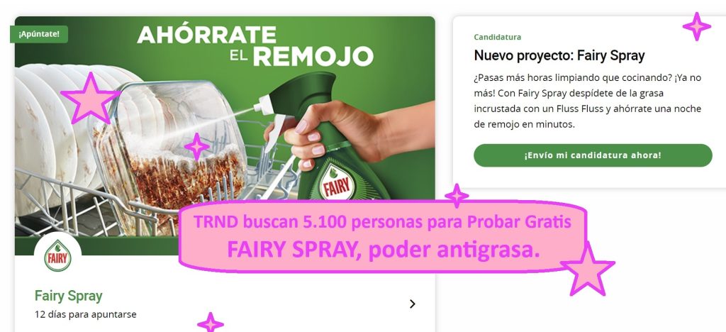 Desde TRND tenemos un gran proyecto en marcha en el que buscan a 5.100 personas para probar gratis FAIRY SPRAY y poner a prueba su poder antigrasa. ¡Si ya estas registrado en TRND manda la candidatura para este proyecto en el que buscan un grupo tan grande de gente! Es relativamente fácil terminar entre los seleccionados.