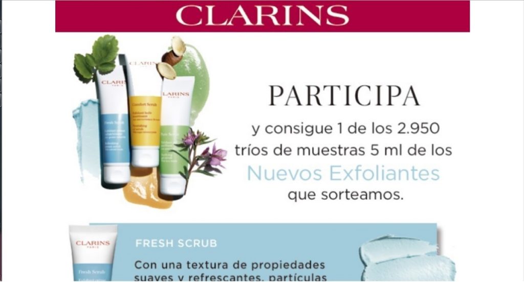Nuevo sorteo Clarins para conseguir un Trío de Muestras Exfoliantes. Ya hemos hablado anteriormente en el Blog de los sorteos de muestras gratis que organiza Clarins, y que a mi personalmente me gustan bastante. Me gustan porque son rápidos y reparten grandes cantidades de muestras, así que os aconsejo que os registréis en este sorteo porque es relativamente fácil ganar.
