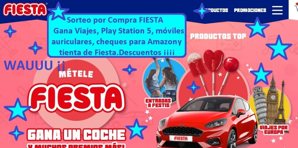 Menudo sorteo tenemos desde Fiesta y es que al registrar nuestros códigos de los productos FIESTA podemos ganar premios muy chulos¡¡¡ Viajes, Play Station 5, móviles, auriculares, cheques para Amazon, tienta de Fiesta, el Corte Inglés … ¡Una pasada la verdad¡ ADEMÁS es un sorteo momento ganador, SABRÁS AL MOMENTO de participar si eres uno de los ganadores y podrás intentarlo tanta veces como códigos FIESTAS consigas.