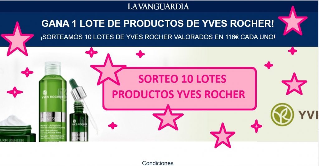 Desde la Vanguardia nos ofrecen un sorteo muy especial¡¡¡ En este sorteo regalan 10 Lotes de productos Yves Rocher valorado en 116 euros¡¡ Es un sorteo muy fácil y rápido, así que os animo a todos a participar.