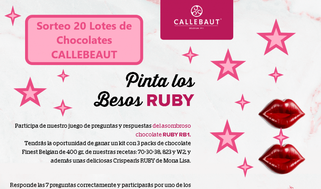 Otro dulce sorteo para San Valentin en el que podemos ganar uno de los 20 lotes de chocolate «Pintando los besos de Ruby» de parte de Chocolates Barry Callebaut. . Cada uno de estos lotes estará formado por un kit con 3 packs de chocolate Finest Belgian de 400 gramos y además unas deliciosas Crispearls RUBY de Mona Lisa.