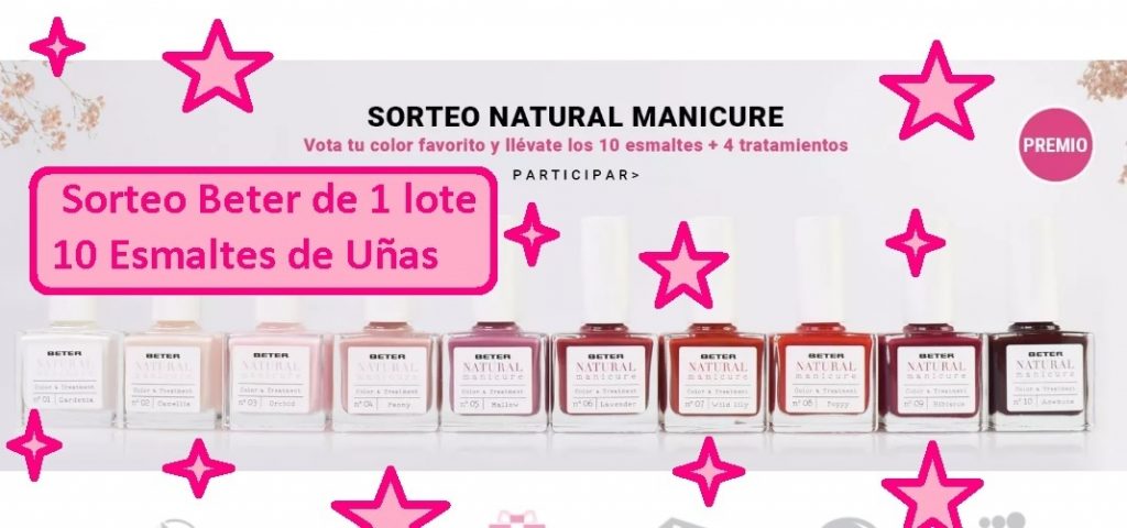 ¡Este mes los protagonistas del sorteo son los esmaltes de uñas¡ La nueva línea Natural Manicure de Beter, son esmaltes con fórmulas veganas y con ingredientes naturales que cuidan tus uñas y del medioambiente. Nos proponemos elegir el tono favorito del nuevo esmalte fortalecedor y entraremos automáticamente en el sorteo de un lote con los diez colores más los cuatro productos de tratamieto: Fast Top Coat, Perfection Primer Base, Magic Oil y Intensive Strengthener.