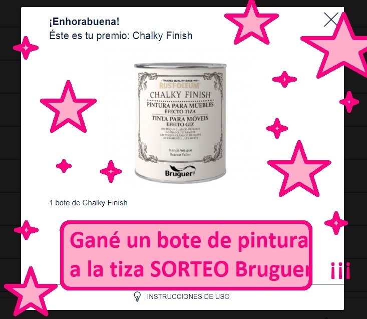 Anoche volvimos a probar suerte en este Sorteo de Bruguer …¡¡Y somos uno de los 70 ganadores¡¡¡ Genial este bote de pintura a la tiza, porque es una técnica fácil para redecorar la casa y darle un nuevo aire¡¡¡¡