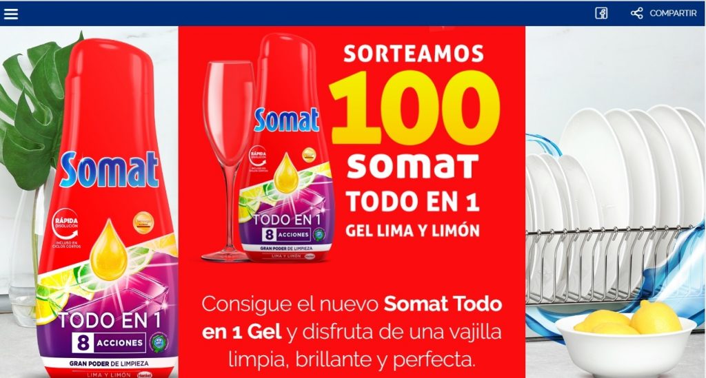 La mayoría de sus sorteos, como es el caso de este en el que van a regalar 100 lavavajillas Somat son » Sorteos Momento Ganador » es decir que sabemos al momento de participar si somos ganadores o no. Y participamos en ellos de manera muy fácil y rápida.