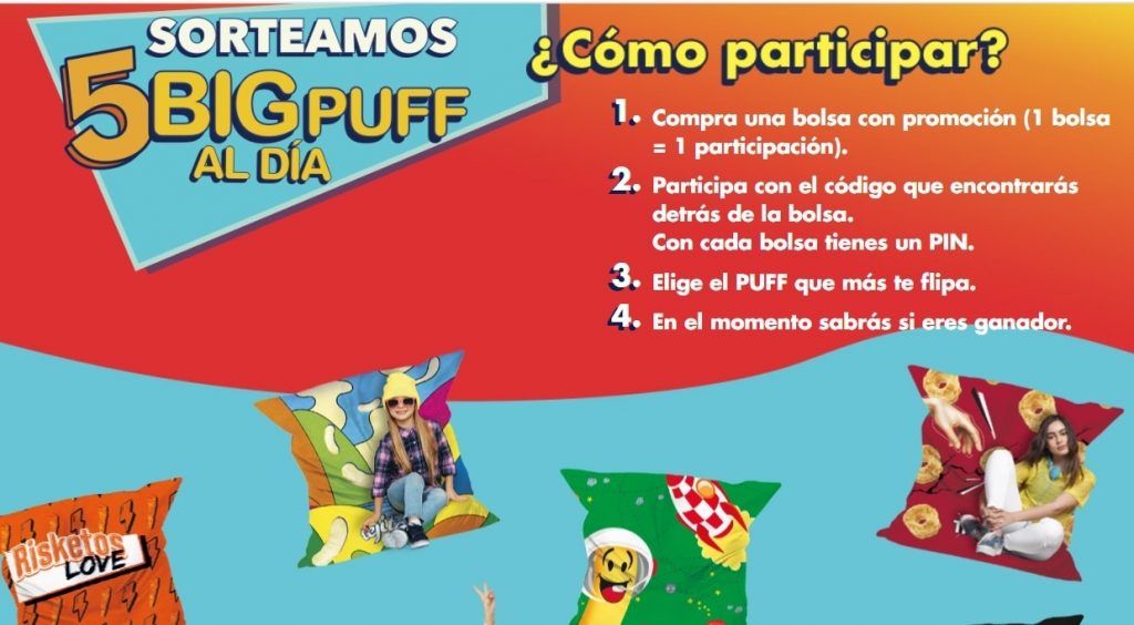 Mediante la dinámica de sorteo momento ganador podrás participar CADA DIA con tus códigos para ver si consigues uno de estos Puffs Gigantes de RISI…. Los Puffs están super chulos y hay un montón de modelos diferentes dónde elegir si resultas ganador …. Podrás escoger el que mas te guste ¡¡¡ Atento que los paquetes deben de llevar la publicidad de esta promo… como los que se ven en la imagen de abajo.
