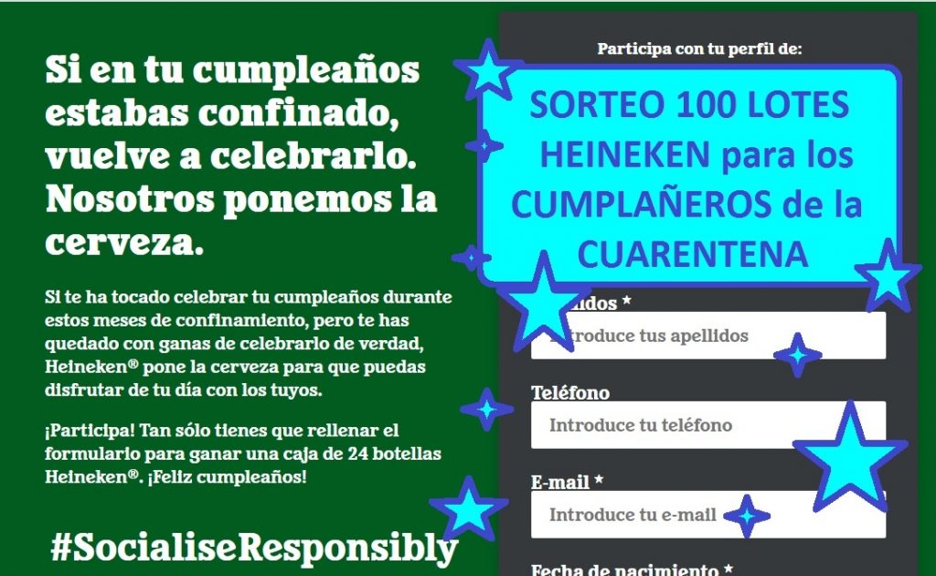 Chicas desde Heineken tenemos otro gran sorteo en el 100 Ganadores se llebarán a acas un Lotes de Cervezas Heineken. Bajo el lema : «Nosotros ponemos la cerveza para celebrar tu cumpleaños si los pasaste en Cuarentena»