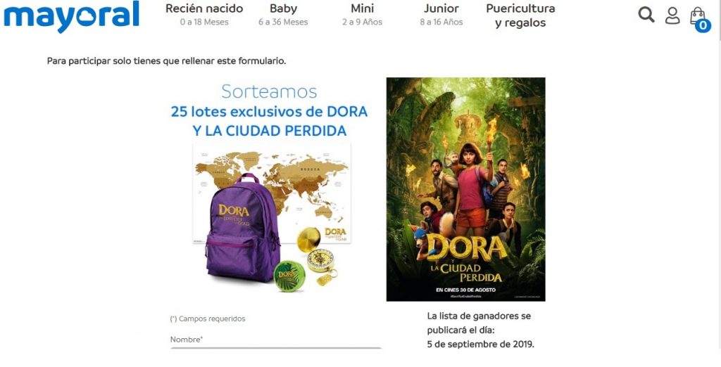Ya sabéis que Mayoral nos ofrece unos cuantos sorteos al año. Ya conocemos su nuevo sorteo y en esta ocasión podrémos conseguir 3 entradas de cine gratis para el preestreno de la peli «Dora y la Ciudad Perdida» y un lote de productos sobre una peli .