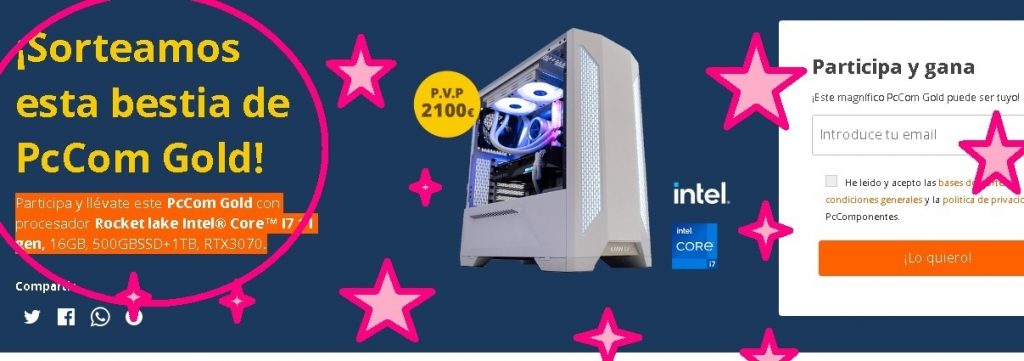 Tenemos sorteo desde PCCOMPONENTES en el que el ganador se llevará Participa este PcCom Gold con procesador Rocket lake Intel® Core™ i7 11 gen, 16GB, 500GBSSD+1TB, RTX3070. ¿¿ A quién no le puede venir renovar el ordenador en casa ? ejejej Por eso apuntada por si hay suerte y dejo el enlace y la info de este sorteo por si alguien se anima, pese a ser un sorteo pequeñito, ya que solo tenemos 1 ganador.