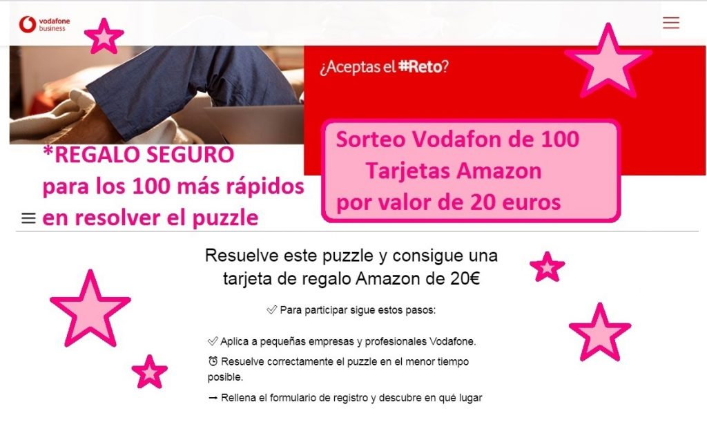 Chicas quería avisaros sobre este Sorteo SOLO para clientes de Vodafon. Es una pena que solo puedan participar las personas que tengan contratado con Vodafon algún servicio. Pero me ha gustado mucho el premio y quiero avisaros para los que seáis clientes. En este sorteo Vodafon los 100 mas rápidos, que serán los primeros en el Ranking se llevarán premio seguro: una Tarjeta Amazon por valor de 20 euros ¡¡¡ Es muy fácil participar y con un poco de insistencia podrás clasificarte entre los 100 primeros y llevarte una de las Tarjetas Regalo...